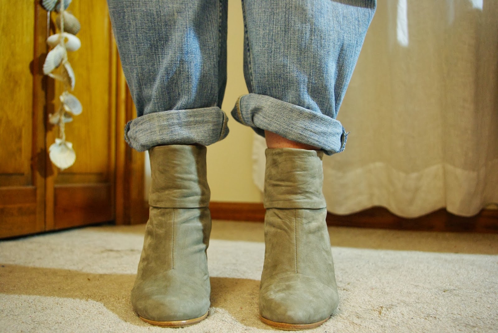 Through my research online I came to the conclusion that what makes the boyfriend jean the boyfriend jean is the boxy cut around the hips and thighs, rolled cuffs and {most importantly, but easy to miss} the gentle taper of the legs. Most men's jeans have legs that go straight down and don't flair or taper at all. If you were to buy men's jeans, roll the cuffs and call it a day, you'd find that A) they don't look at all like what you had imagined and B) the cuffs would unroll almost immediately after putting them on. Super annoying. All you have to do to remedy this is to trim the legs from the knee down. I don't mean hem the bottom, I mean trim the legs {as in narrowing them}. Sounds complicated, but, honestly, it's not.